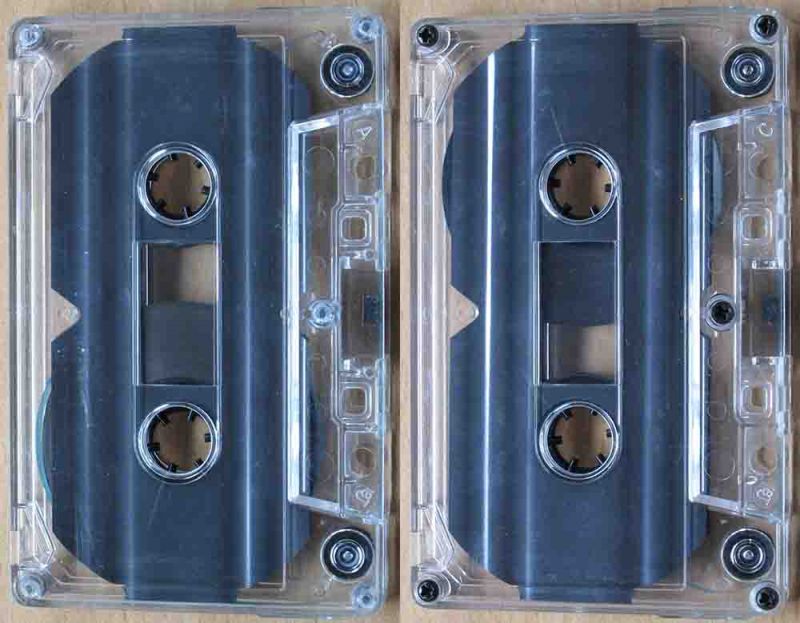 Description: the cassette is a generic blank tape, clear plastic with a dark grey coating on the inside. there is no info on